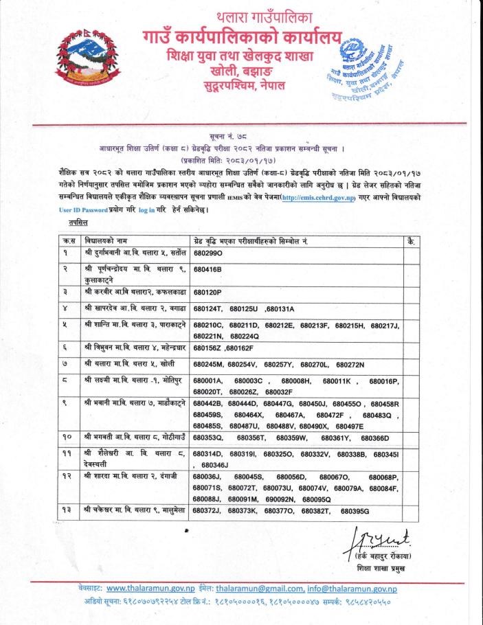 » आधारभूत शिक्षा उत्तीर्ण (कक्षा-८) ग्रेडवृद्धि परीक्षा २०८२ नतिजा प्रकाशन सम्बन्धी सूचना।