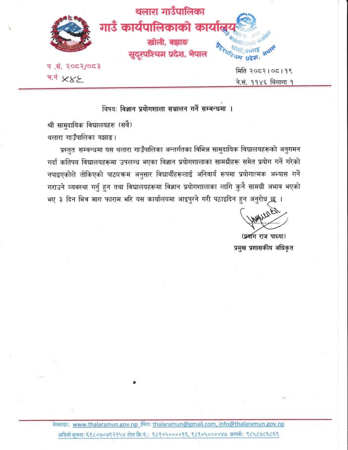 विज्ञान प्रयोगशाला सञ्चालन गर्ने सम्बन्धमा।