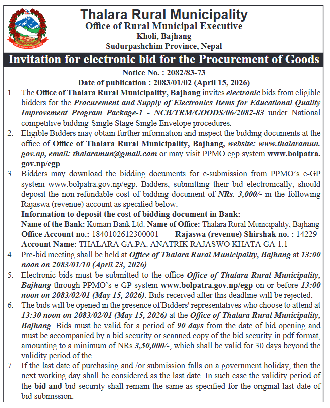 खुल्ला बोलपत्र (NCB) आह्वानको सूचना। (ल्यापटप,स्मार्ट बोर्ड लगायत, मेसनरी उपकरण खरिद)