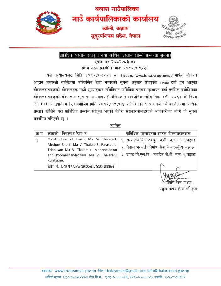 प्राविधिक प्रस्ताव स्वीकृत तथा आर्थिक प्रस्ताव खोल्ने सम्बन्धी सूचना !